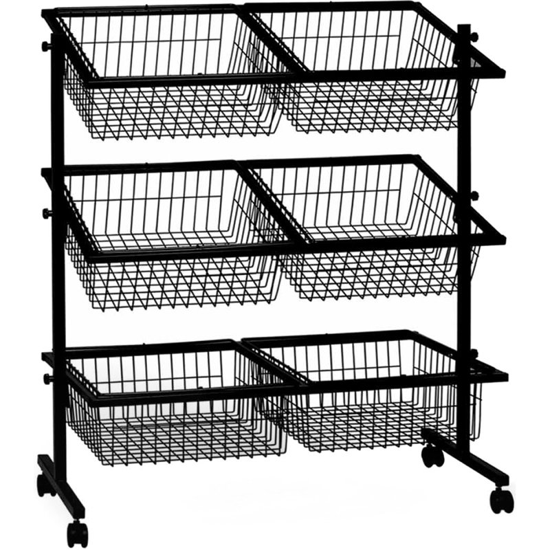 Retail wire storage basket shelving in black. This 3 layer, basket shelving unit&provides a spacious and convenient display suitable for any retail establishment. Featuring 6 tilted baskets and castors with brakes, this unit is ideal for displaying goods in any store.
