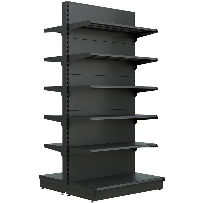 Retail wall shelving gondola unit in black. Built to withstand daily retail use, this fantastic value double sided wall shelving unit provides a spacious and convenient display suitable for any retail establishment.&