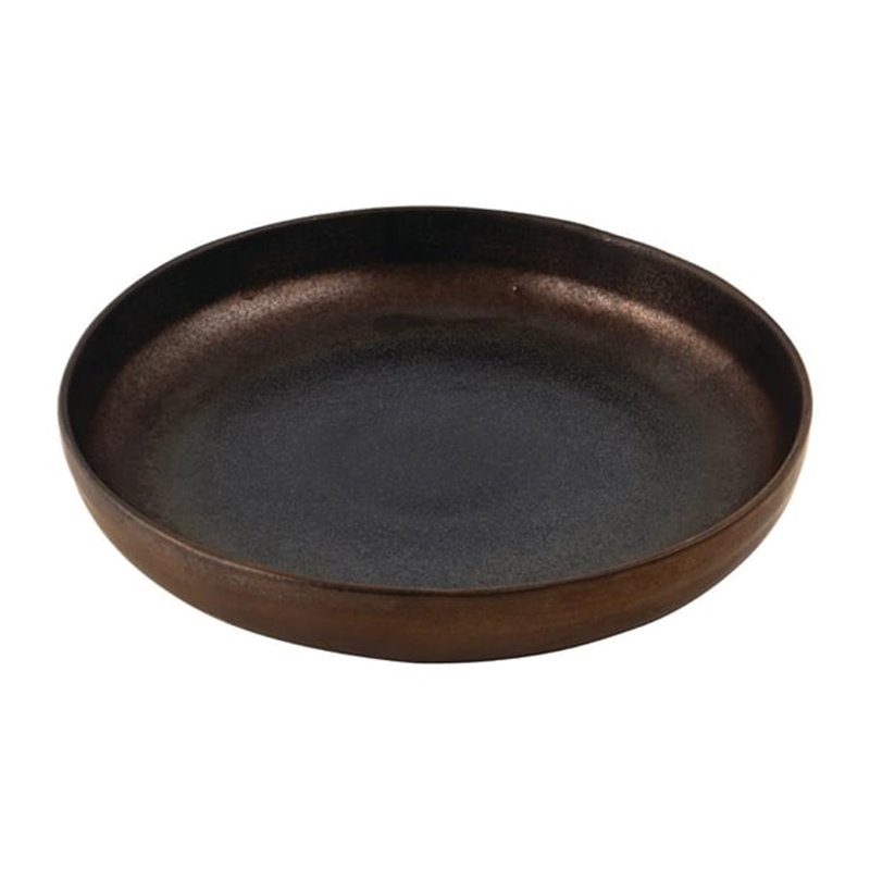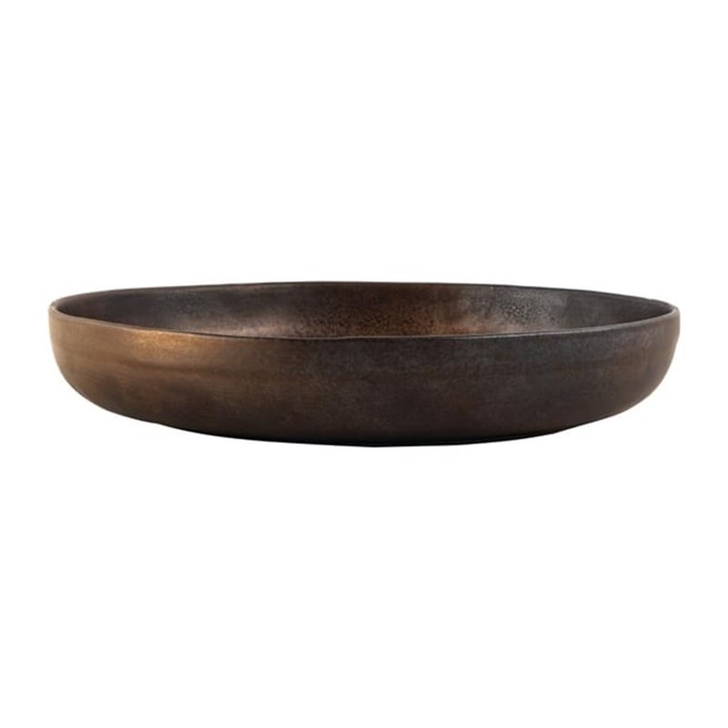 Taking inspiration from the opulent feel of classical pottery, the Ochre collection brings an earthy yet luxurious feel to any table. The matte black underglaze peeks though a metallic bronze finish to give each piece an authentic, worn look that's sophisticated without being showy. The black base layer features a reactive glaze that changes as it's fired, giving the centre a mottled finish that differs slightly from piece to piece. This, coupled with the imperfect shape of the rim, gives it a raw, handmade and artisan feel, ideal for teasing out the authentic feel of rustic, natural-look dishes. The finishing touch comes from the on-trend flat shape, which gives you a wide canvas to get creative with when plating to create dishes that look every bit as good as they taste. Designed to bring a sophisticated, darkly stylish twist to any table, this is crockery that's simply meant to be noticed.