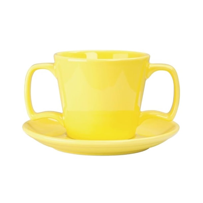 Designed with a double well to catch spills and drips,the Heritage saucer from Olympia is tailor-made for use in care institutions where clients may find more traditional crockery tricky to use. Made to fit the DW149 and DW150 mugs,it comes in the same bright yellow colourway designed to stand out against typical table tops. This makes it easy for dementia patients or those with impaired vision to spot it,which can help to maintain their independence by allowing them to drink without assistance. Made of tough porcelain,the Heritage saucer is also durable enough to endure the bumps and scrapes institutional use can cause. It's also microwave safe,making it ideal for catering for slower drinkers who may need warm drinks reheated. Stackable and dishwasher safe.