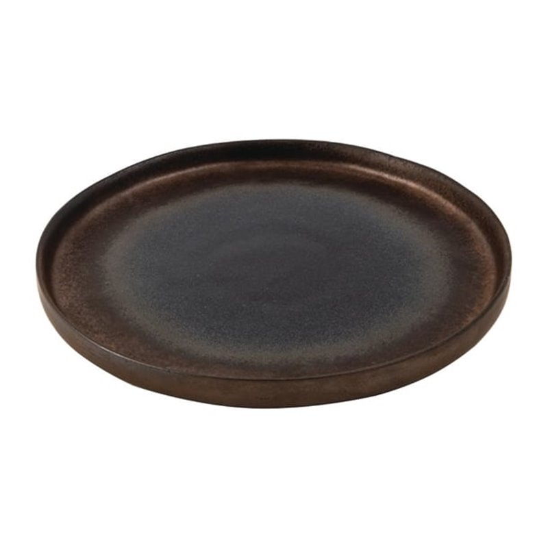 Capturing the opulent look of classical pottery, the Ochre collection brings an earthy yet luxurious feel to any table. The matte black underglaze peeks though a bronze finish, giving it an authentic, worn look that's undeniably stylish. The black base layer features a reactive glaze that changes as it's fired, giving the centre a mottled finish that differs slightly from piece to piece. This, coupled with the imperfect shape of the rim, gives it a raw, handmade and artisan feel, ideal for playing on the authentic feel of rustic, natural dishes. The on-trend flat shape adds the finishing touch, giving you a wide canvas with which to get creative with when plating, giving you the space you need to create dishes that look every bit as good as they taste. Designed to bring a sophisticated, darkly stylish twist to any table, this is crockery that's, simply meant to be noticed.