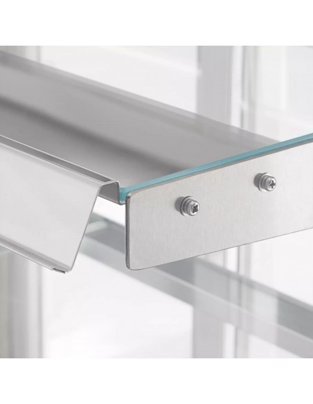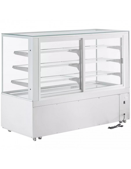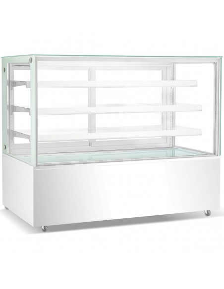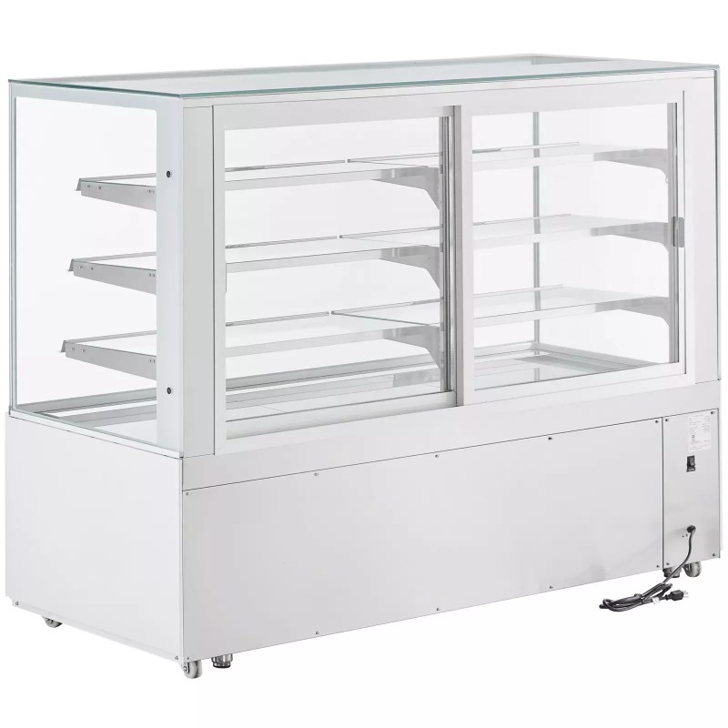 Professional chilled merchandiser great for showcasing cakes and pastries in cafes, restaurants or shops. This great value for money refrigerated display unit is the perfect counter top display refrigerator for commercial use. Display your signature cakes, pies, cookies, and muffins with ease. This display case features bright, cool LED lighting that is designed to show off your baked products! With a proper display, your bakery items can merchandise themselves and increase impulse sales. The case also has three interior tempered glass shelves that you can adjust depending on the items you want to display. The flat front glass provides an unobstructed view of your food while the side glass panels and rear glass access doors ensure that customers can see the case's contents from any angle.