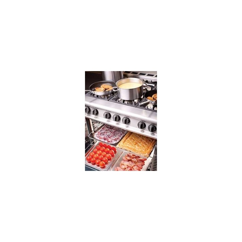 The Falcon 6 Burner Dominator Plus Range G3101 Natural Gas with Castors features high performance burners with cast iron pan supports and a general purpose oven. The removable stainless steel hob and vitreous enamelled gas oven chamber are both easy to clean as well as to use. The wide temperature range and five shelf positions make the range extremely versatile and the twin oven doors with individual catches helps retain heat increasing energy efficiency. The range also features laser etched control icons and low profile oven door handles for reduced intrusion into working space and is 2/1 Gastronorm compatible.