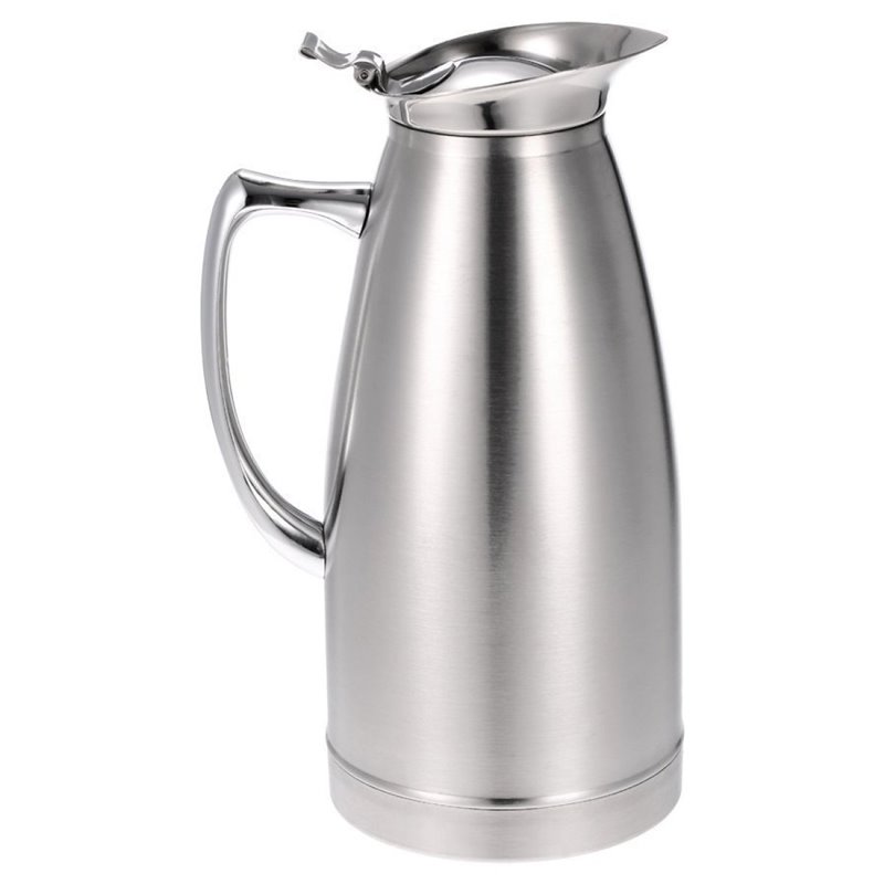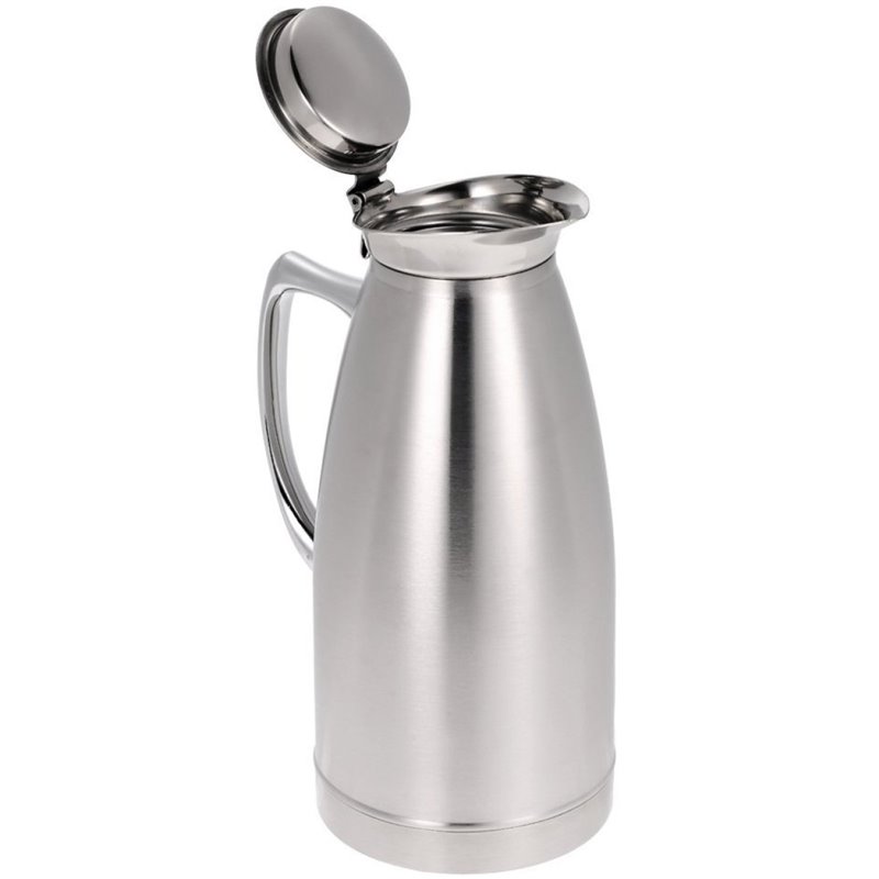This modern design stainless steel coffee pot has a double layer handle for a comfortable pour. The hinged lid has a handle for a controlled pour, whilst the compact spout makes for a drip free pour and easy storage. Suitable for commercial dishwashing and available in larger sizes.