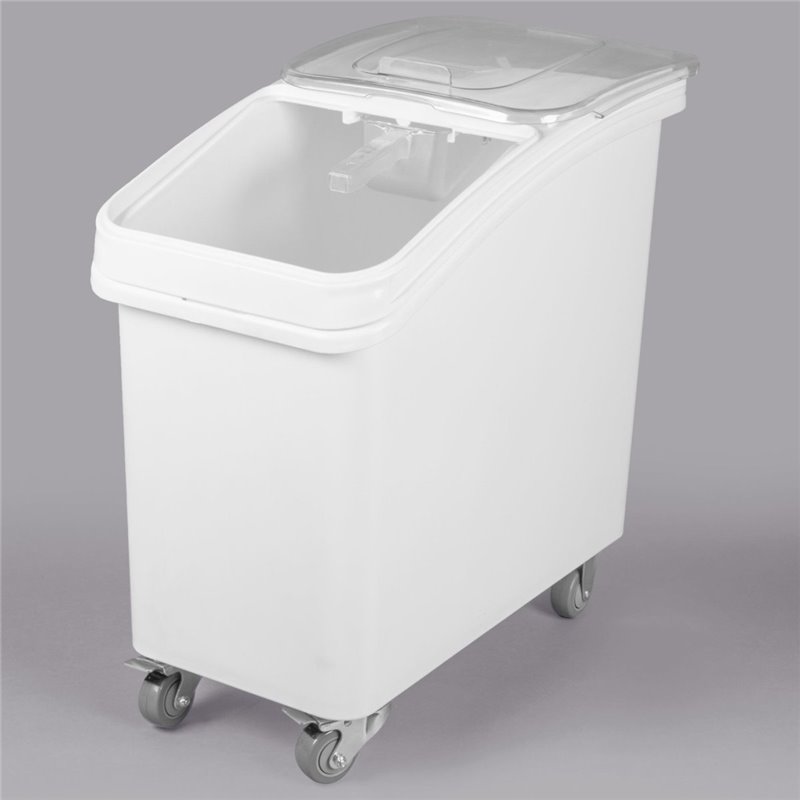 This bin is perfect for storing large quantities of dry ingredients under counters or in storage areas. Its 430 cup capacity can hold 129 lb. of flour or 191 lb. of sugar. A durable lid is designed to lock in freshness while keeping contaminants out. With an included scoop to help dispense your products, this ingredient bin is the perfect bulk storage solution your kitchen needs. The scoop stays in one designated area to reduce the risk of cross contact between the food and food container.
