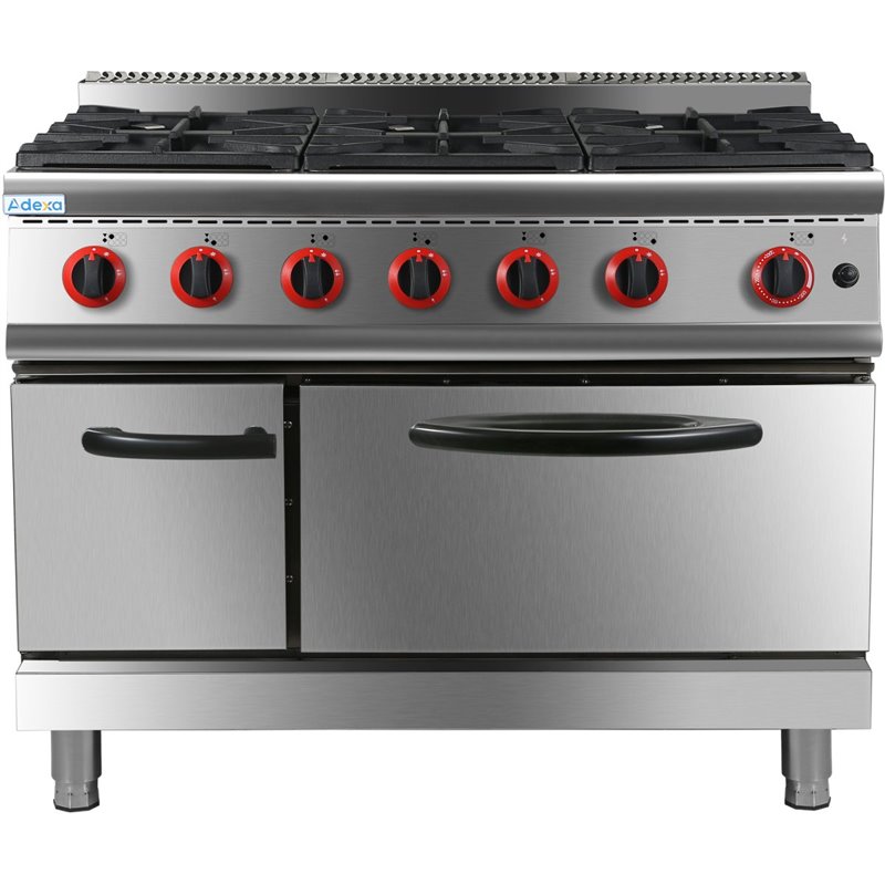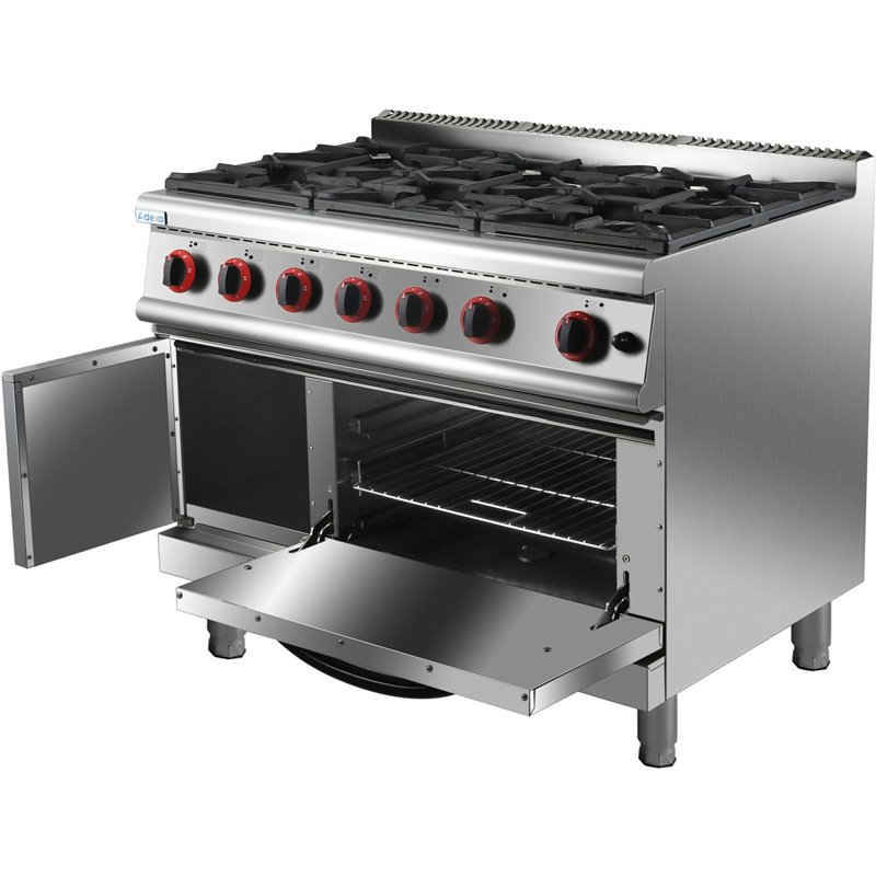 Heavy duty, high quality 6 burner gas range oven constructed from stainless steel. This gas range oven features 6 high quality burners with flame out protection, with cast iron pan supports and chrome burners.