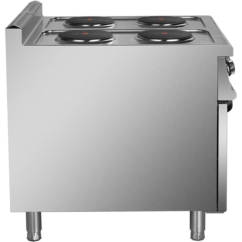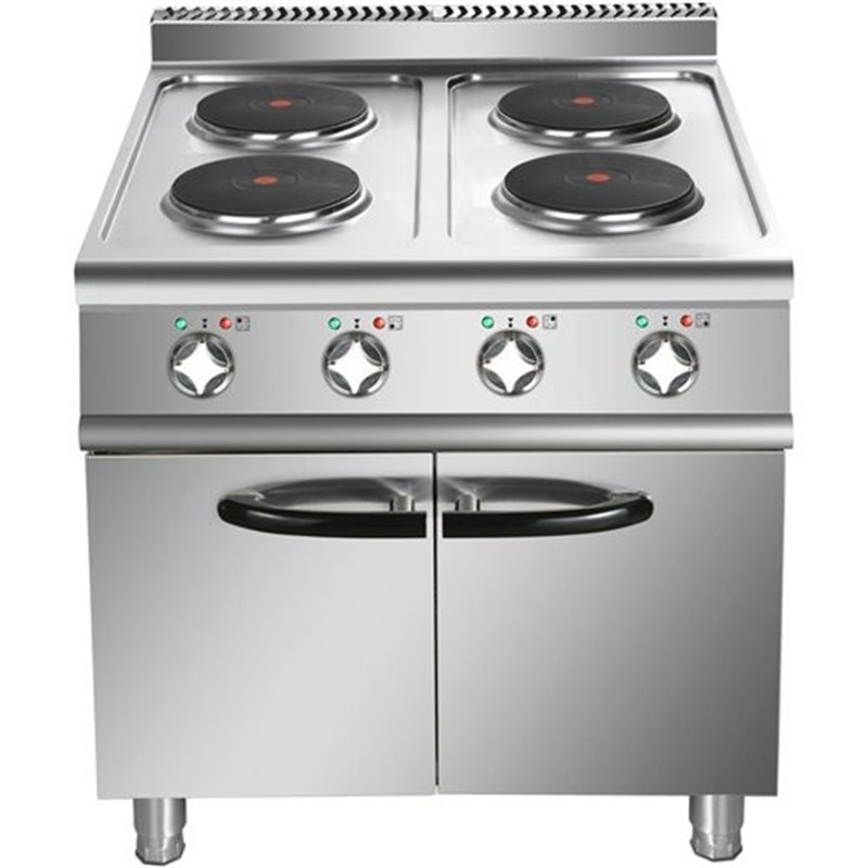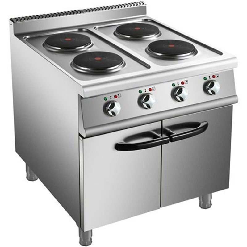 Heavy duty, high quality 4 burner electric cooker with cabinet base constructed from stainless steel. This electric range oven has a depth of 900mm to seamlessly fit in with our modular cooking range.