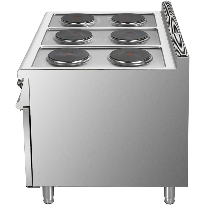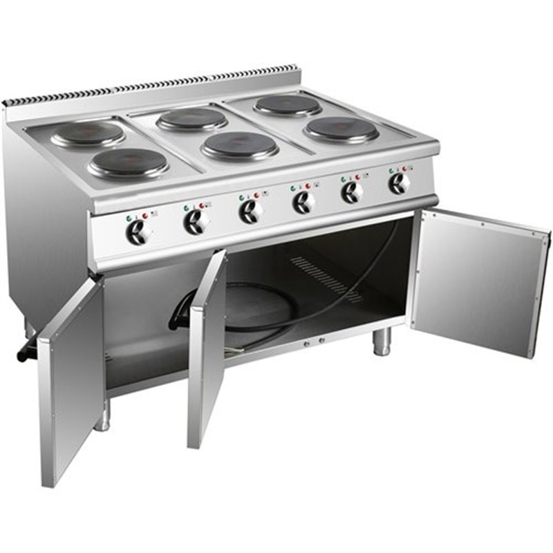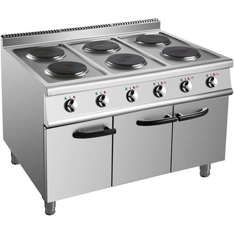 Heavy duty, high quality 6 burner electric cooker with cabinet base constructed from stainless steel. This electric range cooker has a depth of 900mm to seamlessly fit in with our modular cooking range.