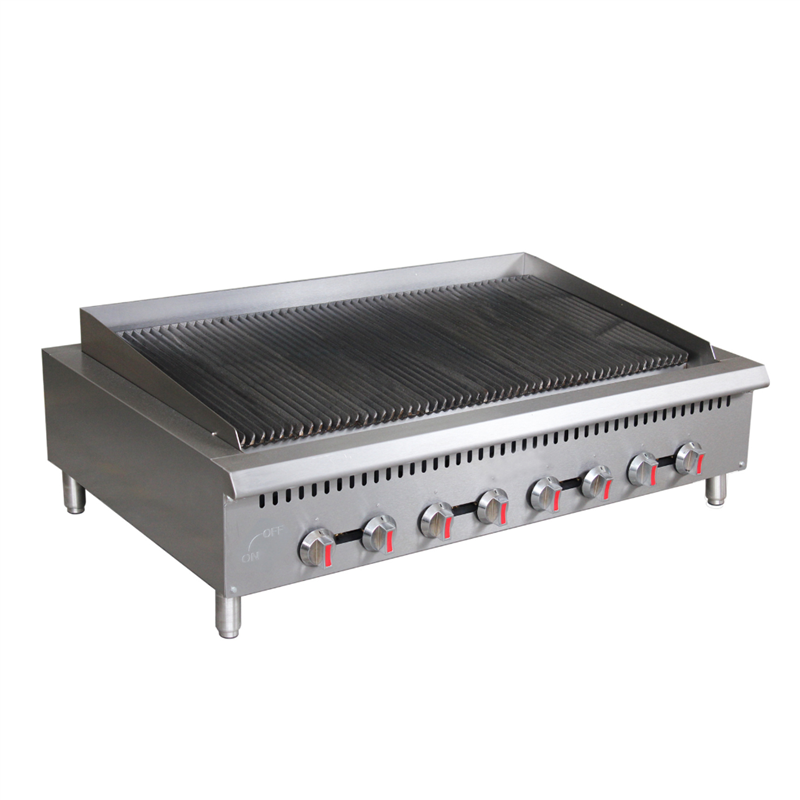 These heavy duty, compact and efficient cooking devices features a series of gas-powered cast iron bar burners (each 20,000BTU/hr) positioned beneath a grate or grill surface, controlled every 12” width. They are specifically engineered for high-temperature grilling and searing, making it ideal for cooking a variety of foods such as steaks, burgers, chicken, seafood, and vegetables.