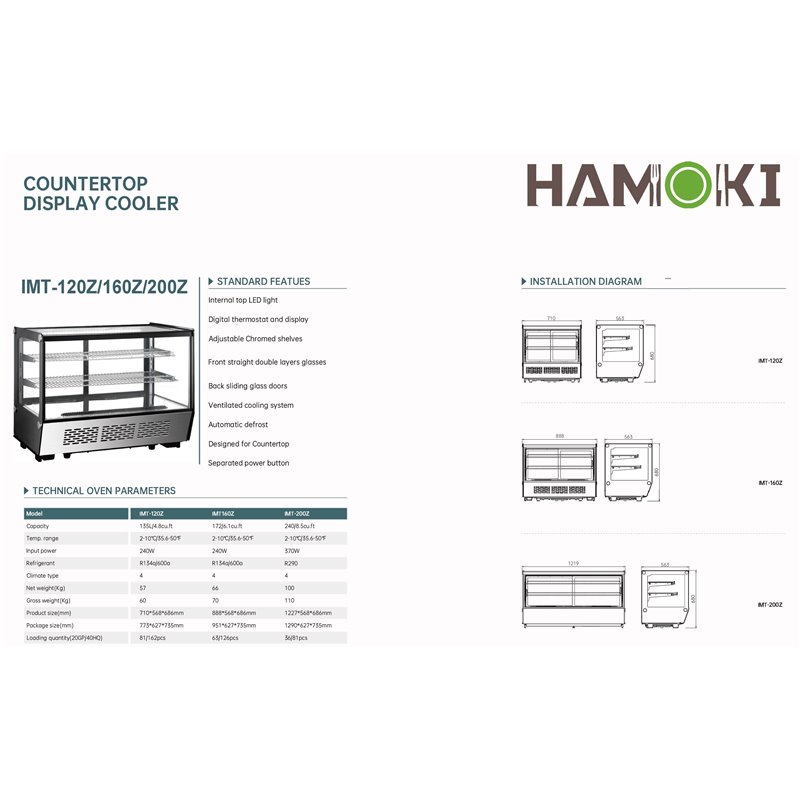 The Hamoki Countertop Display Coolers are versatile and stylish equipment for any food service establishment, such as restaurants, delis, cafeterias, bakeries or even hotels. These compact countertop commercial refrigeration units are designed with back sliding glass doors, and all 4 sides in glass, providing customers and staff easy viewing of the selection available, making it a convenient and enticing way to showcase your menu offerings while protecting from contaminants.