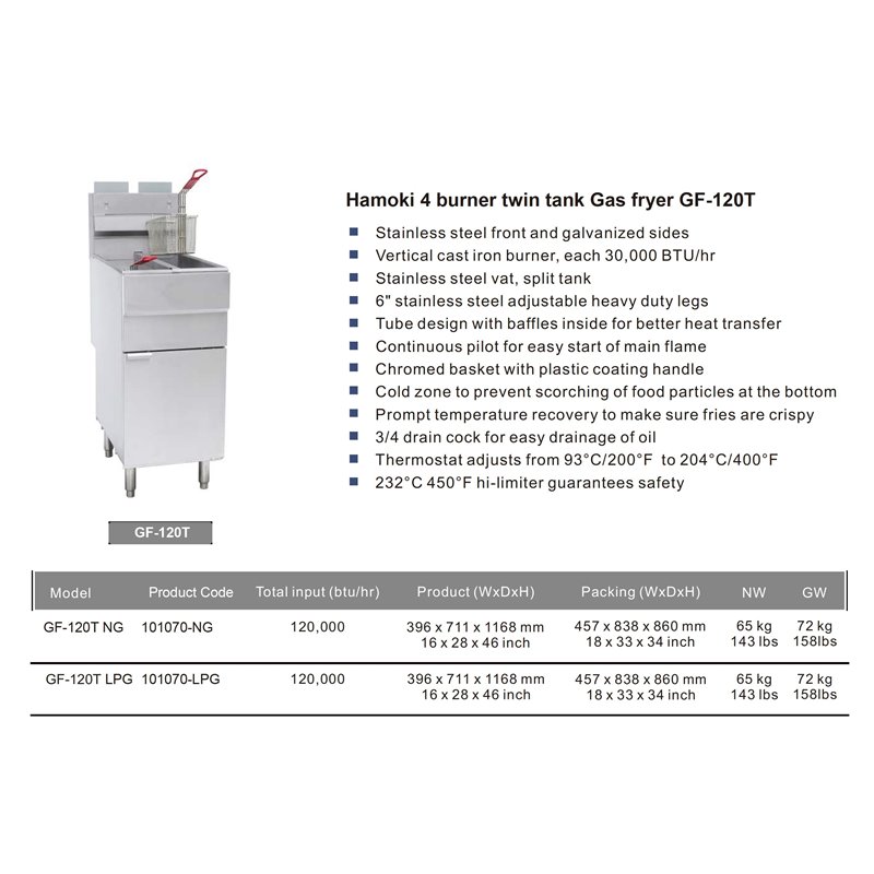 GF120T 4 Burner Twin Tank Gas Fryer with Twin Baskets- Commercial Heavy Duty Fryer