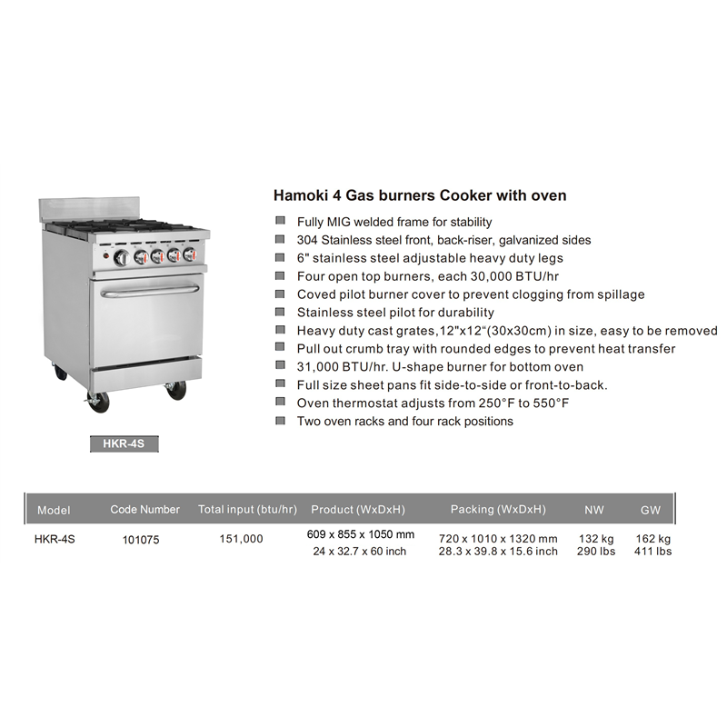 101075 - Hamoki Gas Range 4 Burner with Oven HKR-4S