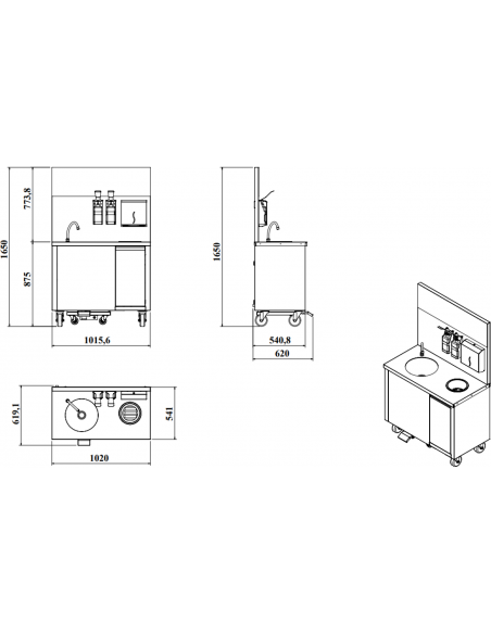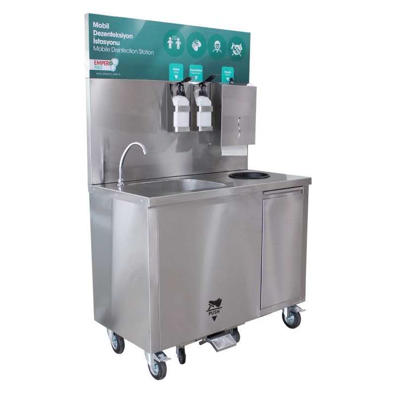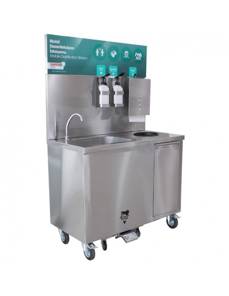 This mobile hand wash station can be quickly placed wherever it is needed. In the entrance area of shops and supermarkets, offices, as well as in hospitals, nursing homes or at home in private areas. It does not need to be connected to water mains!