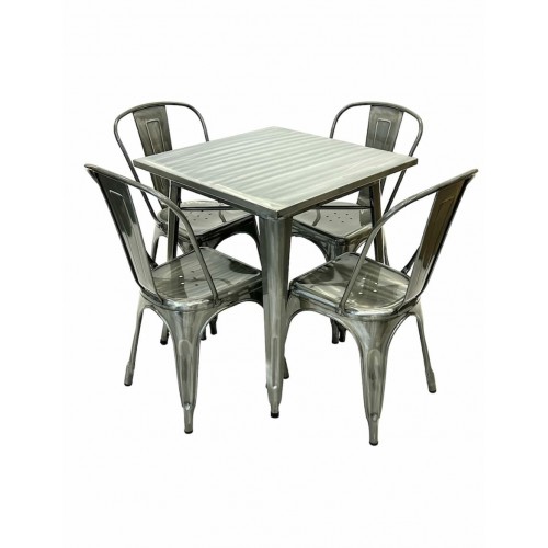 Our stunning Silver Tolix set comprising of one 70cm square silver tolix table and four of the silver tolix chairs.