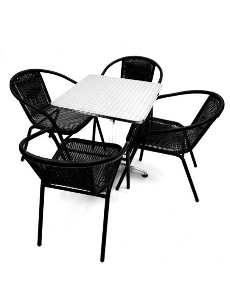 - Black garden set comprising of an aluminium 70cm diameter Square bistro stacking table and four black Rattan chairs.