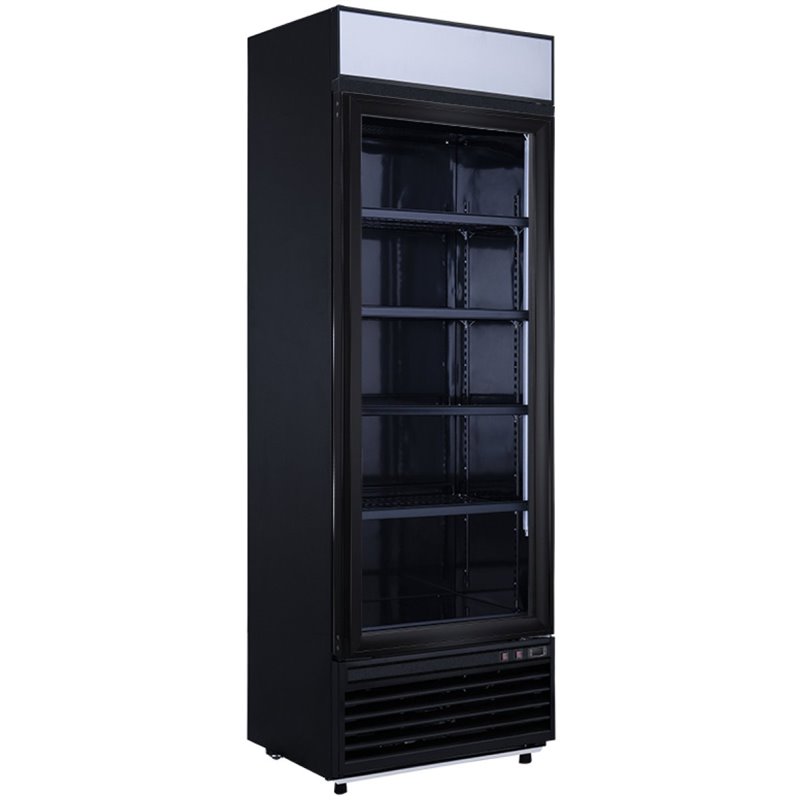 A full height double door commercial display freezer with LED canopy light. The unit boasts a stylish black exterior finish with a double glazed, hinged glass door. The interior is illuminated with energy efficient LED lighting create an eye catching product display. With a 13 amp plug connection the unit can simply be plugged in for use. The cabinet is supplied with 4 shelves with 400 litre capacity.