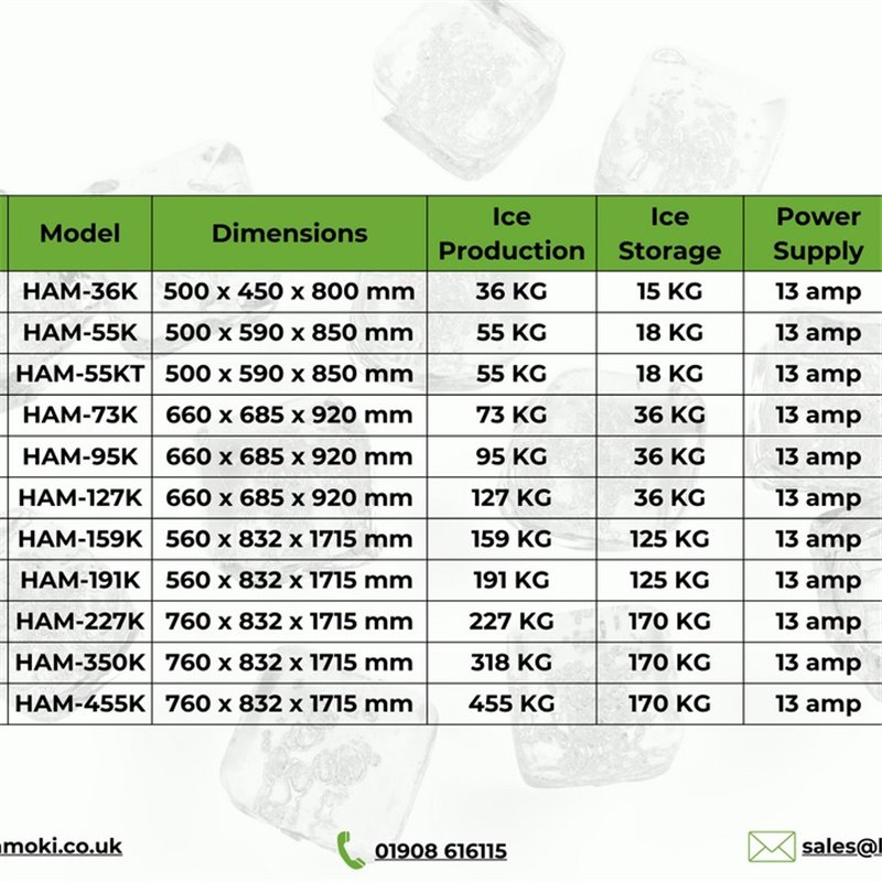 The new heavy duty Hamoki HAM-455K is ideal for all kinds of kitchens in bars, restaurants and hotels. Equipped with a user-friendly integrated digital control panel, ample bin capacity, and automatic cut off levels, this ice machine is the perfect essential to upgrade your kitchen.