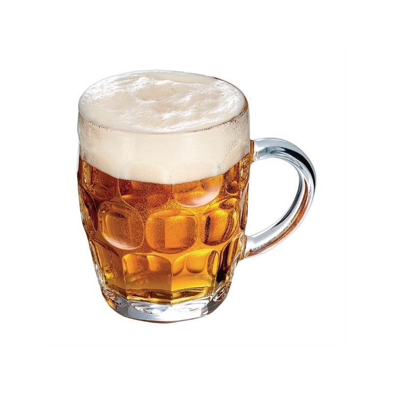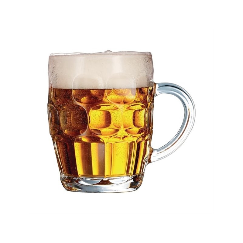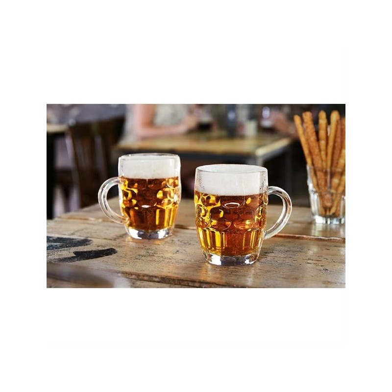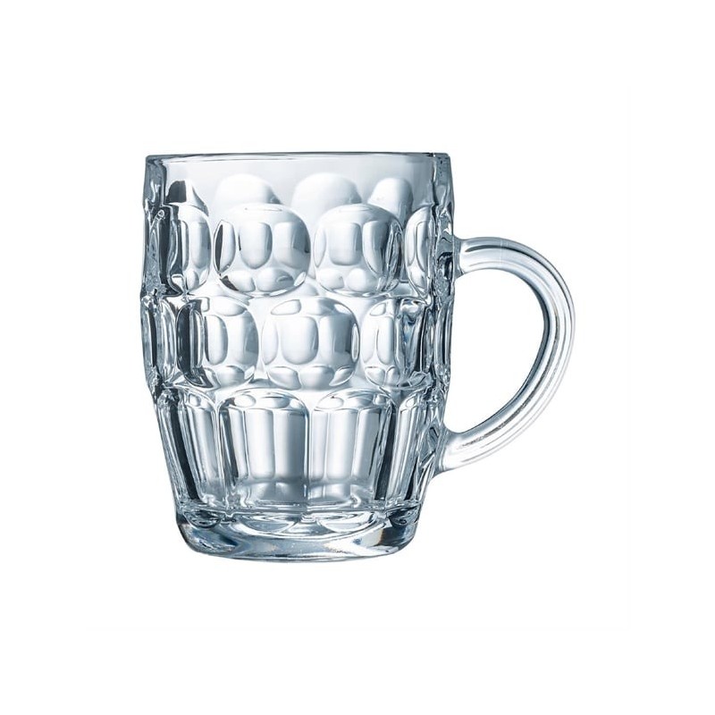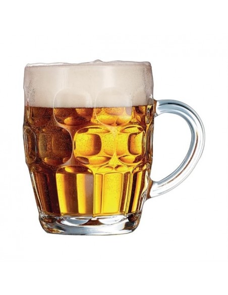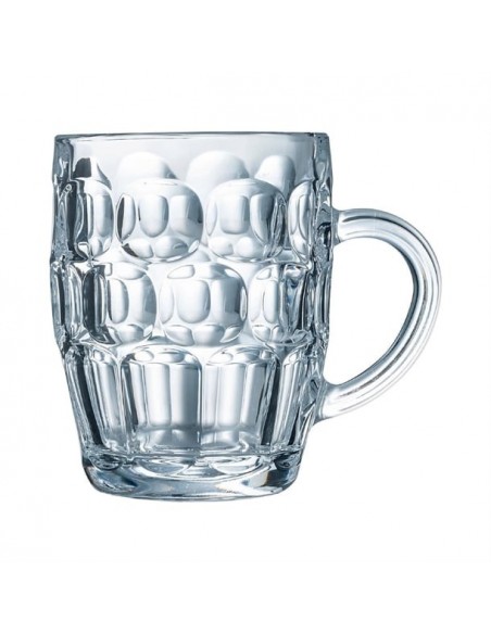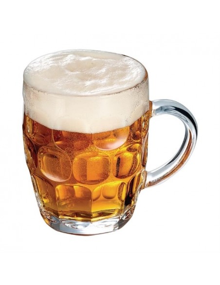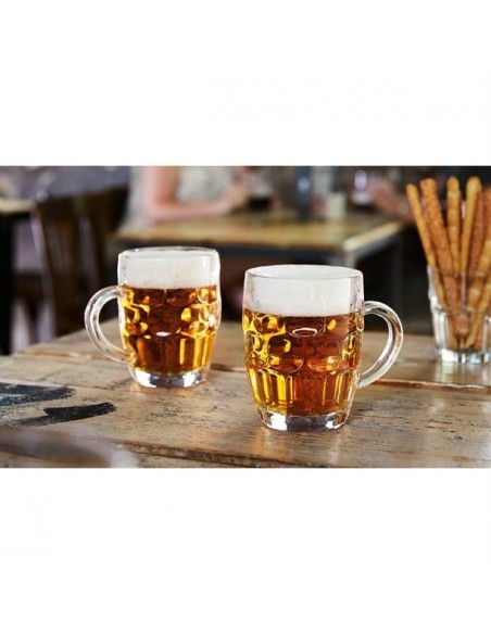 Arcoroc's Britannia tankards offer a traditional beer serve with their classic dimpled design. Ideal for bar professionals, these tankards are crafted from thick glass for ultra shock resistance. This thickness not only ensures durability but also helps maintain your beer's ideal temperature for longer. Topped off with a wide, comfortable handle for a perfect grip, these tankards are built to elevate your beer drinking experience.