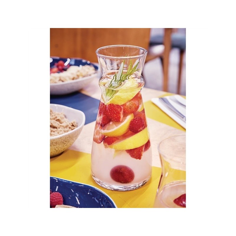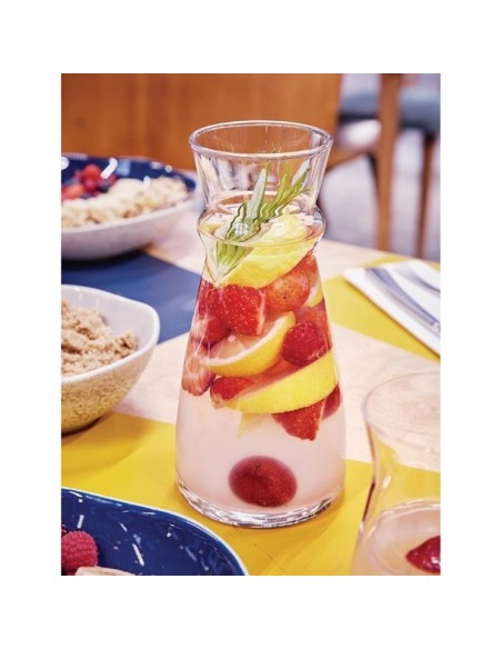 Arcoroc's Fluid carafes are built for both function and style. Their ergonomic design allows for easy handling during service, and the natural gauge makes it simple to fill them to the perfect level. The heavy base ensures excellent stability on the table or when carried on a tray. Crafted from soda-lime glass, these Fluid carafes are highly durable and are designed to last through 2,000 dishwasher cycles without showing wear.