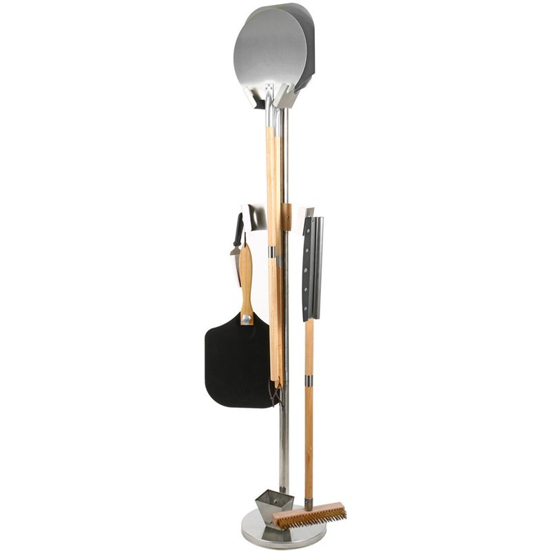 Set of 6 professional pizza oven tools, compete with a holding stand. Including 3 professional 12" pizza peels, a pizza cutter, spatula, and a cleaning brush with scraper for oven cleaning.