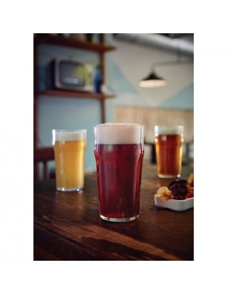 A reliable classic, Arcoroc's Nonic tumblers are the go-to beer glass for venues everywhere. Their simply stackable design enables easy storage but also sits in the hand comfortably. Made from extra-resistant fully tempered glass, they're highly durable and great for busy venues. They also break into small shards when broken, increasing the safety for both customers and staff. Plus, these Nonic tumblers are dishwasher friendly, ensuring a quick turnaround of fresh glassware during service.