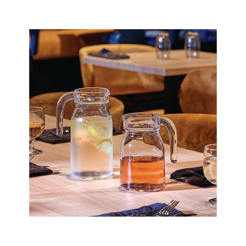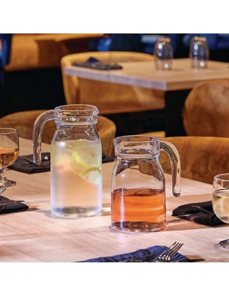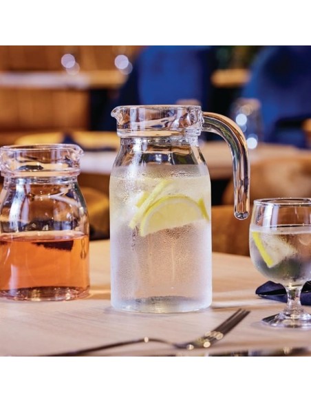 Serve water, wine or juice with these 750ml Arcoroc Spring jugs. Thanks to their ergonomic handle, these jugs are easy to transport to and from your guests' tables. A wide spout ensures that the Arcoroc jugs dispense drinks quickly and accurately.