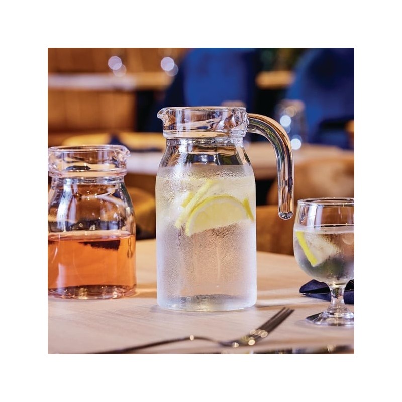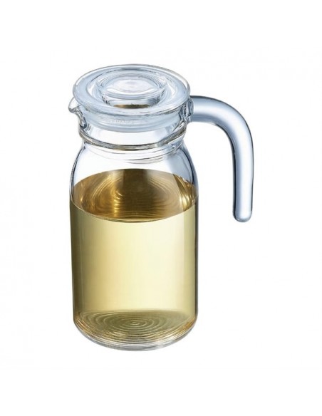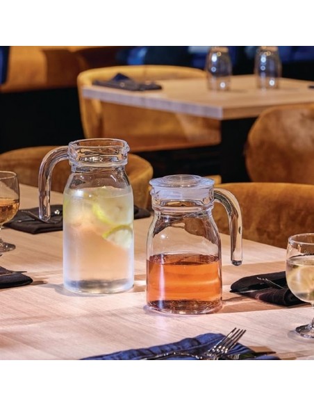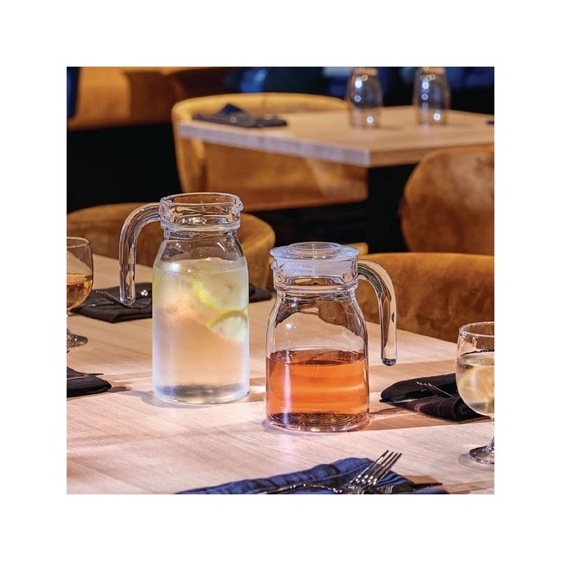 Serve water, wine or juice with these 750ml Arcoroc Spring jugs with lids. Thanks to their ergonomic handle, these jugs are easy to transport to and from your guests' tables. A wide spout ensures that the Arcoroc jugs dispense drinks quickly and accurately. Additionally, the jugs include matching lids that lock-in freshness and protect contents from contamination.