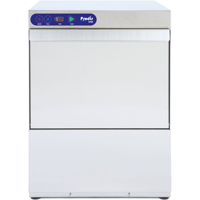 The heavy duty Prodis EV40 glass washer, featuring a bright LED electronic control panel with a selectable wash cycles and intuitive display.