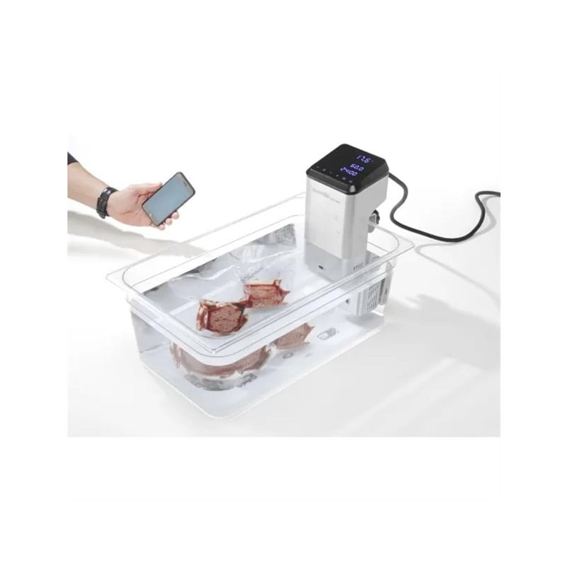 The SVT-01006 SousVideTools iVide Plus Thermal Circulator boasts a high-resolution, wide 5-inch Touch Screen interface. With WIFI capability, you can conveniently control it remotely through the dedicated app, prioritising ease of use. Engineered for food safety, this circulator features an impressive 80-litre capacity and ensures temperature stability of 0.07°C within the range of 40°C to 100°C.