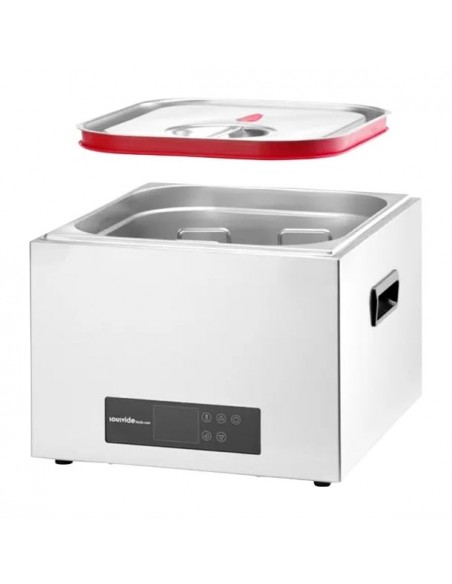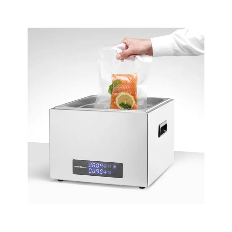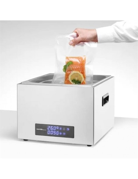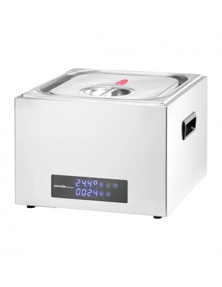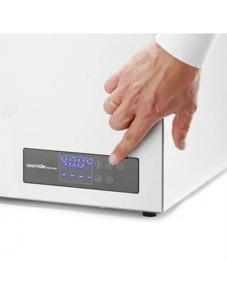 The SVT-01001 SousVideTools 14-Litre Compact Water Bath features a vibrant blue touch screen display, ensuring visibility throughout the kitchen. With a remarkable accuracy of 0.1°C, this water bath is designed to meet high standards. Engineered for professional chefs, its solid and contemporary design ensures durability.