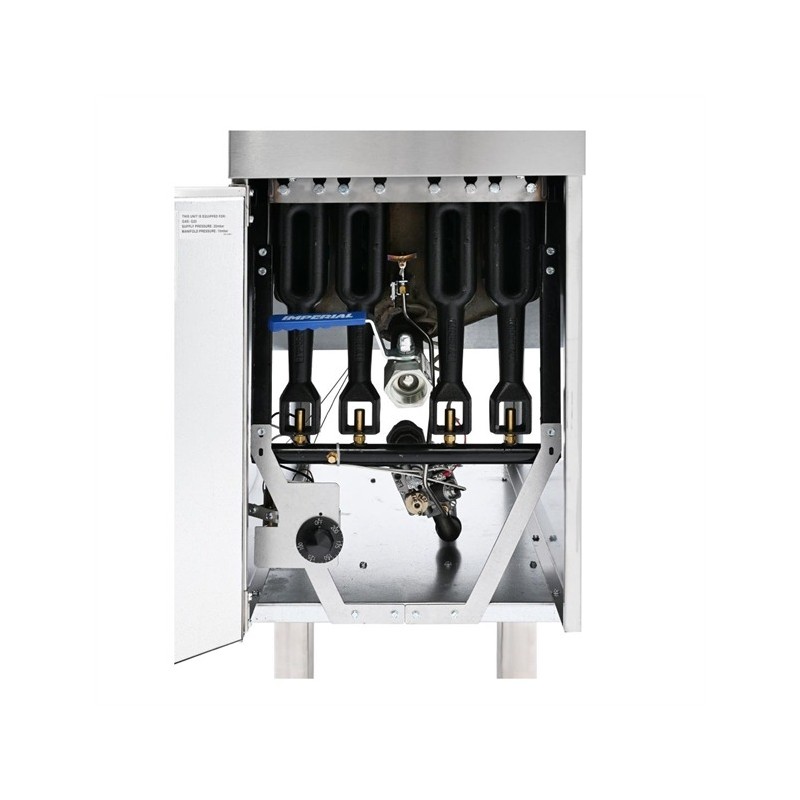 - Open pot burners - flame heats stainless steel plates located strategically outside of the frypot