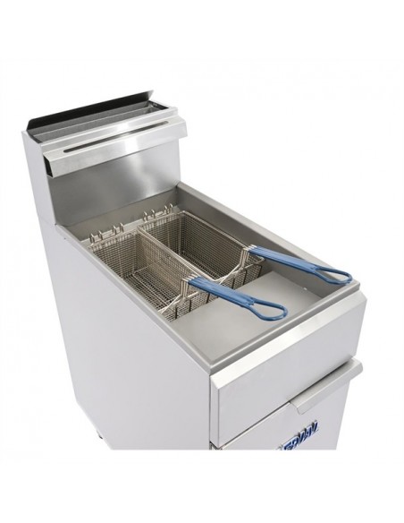 - Two large, nickel-plated fry baskets with vinyl coated, heat protected handles