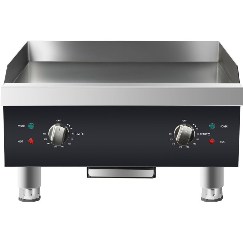 Powerful and reliable, this professional steel griddle features a generously sized steel cooking surface that is all smooth, perfect for breakfast, lunch or dinner services. The heavy duty elements ensure a rapid heat up and an even spread of heat across the wide griddle surface. With simple dial thermostat control, the restaurant griddle is incredibly easy to use, clean and maintain. This catering fry top is an incredible bargain at the current discount sale price.
