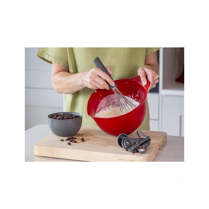 This KitchenAid measuring spoon set includes five different spoon sizes: ¼ tsp (1.25ml), ½ tsp (2.5ml), 1 tsp (5ml), ½ tbsp (7.4ml) and 1 tbsp (15ml). These spoons work with both wet and dry ingredients. Durable and BPA-free, each spoon has its size printed in easy-to-read letters on its handle, in both metric and US units. The spoons are designed to nest, with a thick ring to secure them together for easy organisation and storage. Dishwasher safe (top rack recommended) for easy cleanup. A superb measuring spoon set for everyday use.