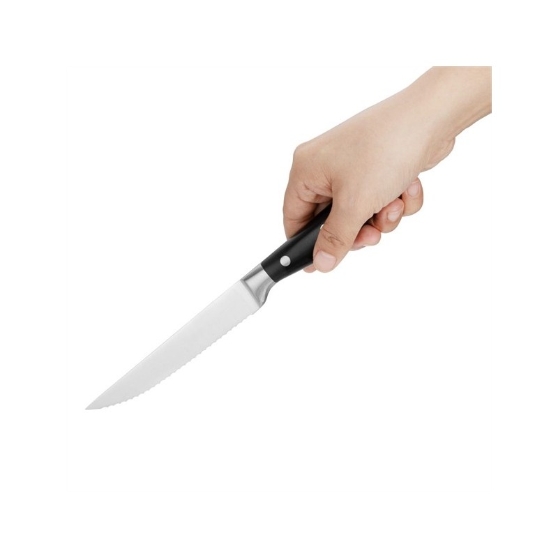 - Serrated blade effortlessly cuts through steak