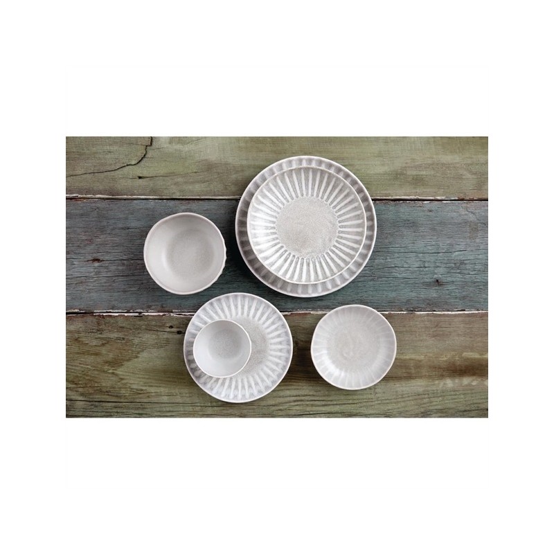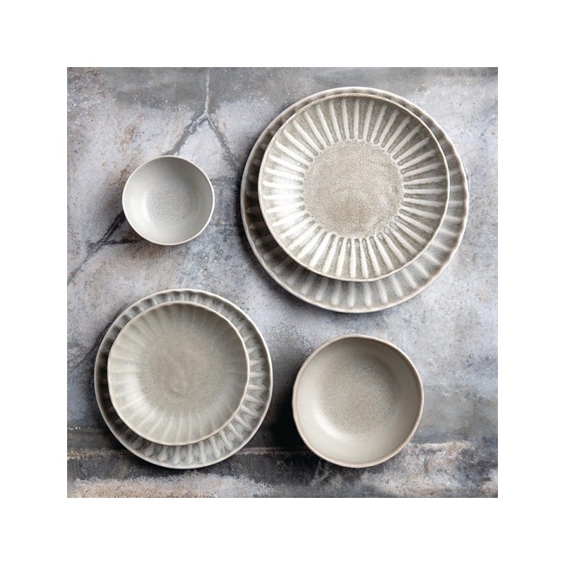 - Fossil-inspired embossed rim perfectly frames loosely plated dishes