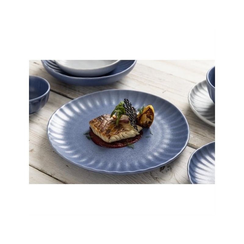 Tapping into the industrial trend's use of natural materials, the plates are finished in a blue colourway that captures the trend's contemporary appeal. The undulating fossil-inspired pattern adds the finishing touch, helping to frame your dishes - ideal for more experimental dishes that call for a bold backdrop to tie them together. Finished with an imperfect, rustic shape that captures the relaxed feel of handmade artisan pottery, and a flat base that gives you a wide canvas to get creative with when plating, this is crockery for the creative chef.
