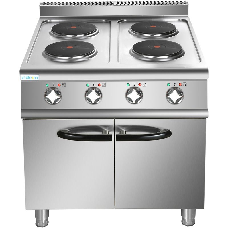 Heavy duty, high quality 4 burner electric cooker with cabinet base constructed from stainless steel. This electric range oven has a depth of 900mm to seamlessly fit in with our modular cooking range.