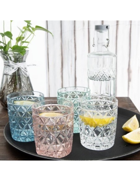 Add a splash of colour to your cocktail service with these pink pastel-coloured short drink tumblers from Olympia's Havana collection. Featuring a playful, retro design, the 300ml tumblers boast a sophisticated cut-glass pattern that catches the light beautifully. Crafted from durable soda lime glass, they have rolled edges to prevent chipping and are dishwasher safe for easy cleaning.