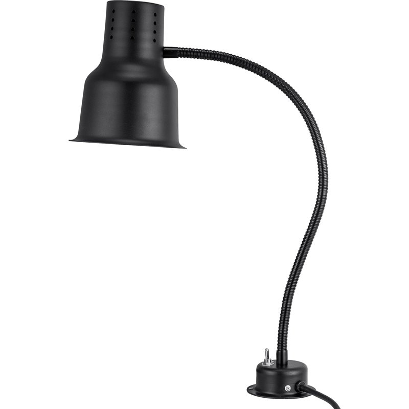 Keep your food hot and fresh with this sleek black food warming lamp. Equipped with an infrared heating bulb and flexible arm for targeted heat control, this heating lamp can be installed by clamp or screw to your food service station.