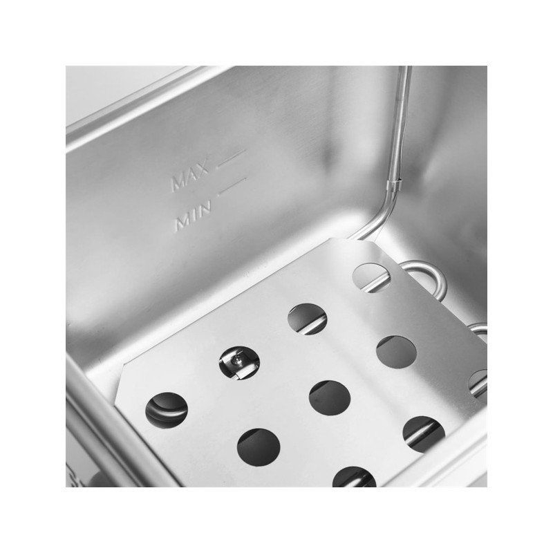 Once you're done for the day, the whole fryer is easy to clean and maintain. The front-mounted drain tap makes the process even easier - there's no need for lifting heavy pans of oil - simply put a container underneath and open the tap. The V-shaped pan maximises the oil drained away, leaving it ready for cleaning and refilling. And when the fryer is not in use, the included stainless steel lid helps to protect the oil until the next cook.