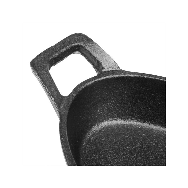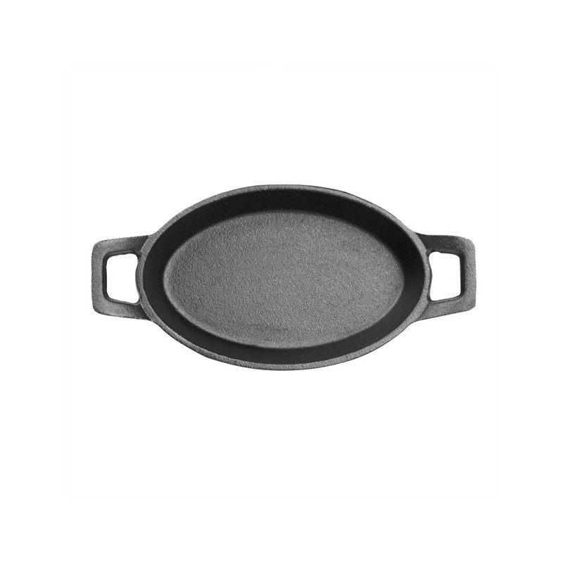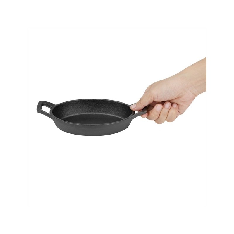 Prepare and serve food with a sizzle using this 150(L)x100(W)x30(H)mm cast-iron oval eared dish from Olympia. The dish is oven safe and designed for oven-to-table service - meaning you'll cut down on dishes and speed up your turnaround by saving time on plating up. Plus, the eared dish features two sturdy handles that are easy to carry, reducing the risk of accidental drops and spills. As well as being incredibly strong, the cast iron also has an authentic look that brings a rustic charm to your service, impressing guests with the presentation of their meal. For added convenience, the dish can be used on all cooking surfaces, including induction hobs.