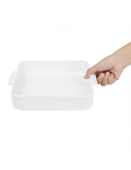 A small sized roasting dish from Olympia, designed to be used as oven to tableware for individual portions, or for serving side dishes for the table. Made from hard-wearing pure white porcelain, it's an ideal crockery solution for busy hotels, canteens and restaurants. Strengthened rolled edges ensure the roasting dish is chip resistant and the fully vitrified body gives great glaze durability, making it ideal to withstand the rigours of the professional catering environment. Oven, microwave, dishwasher, and freezer safe, this roasting dish offers resilience and versatility for any culinary task.