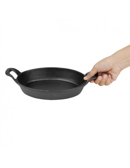 Prepare and serve food with a sizzle using this 220(L)x150(W)x30(H)mm cast-iron oval eared dish from Olympia. The dish is oven safe and designed for oven-to-table service - meaning you'll cut down on dishes and speed up your turnaround by saving time on plating up. Plus, the eared dish features two sturdy handles that are easy to carry, reducing the risk of accidental drops and spills. As well as being incredibly strong, the cast iron also has an authentic look that brings a rustic charm to your service, impressing guests with the presentation of their meal. For added convenience, the dish can be used on all cooking surfaces, including induction hobs.