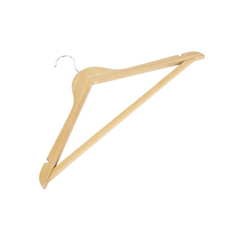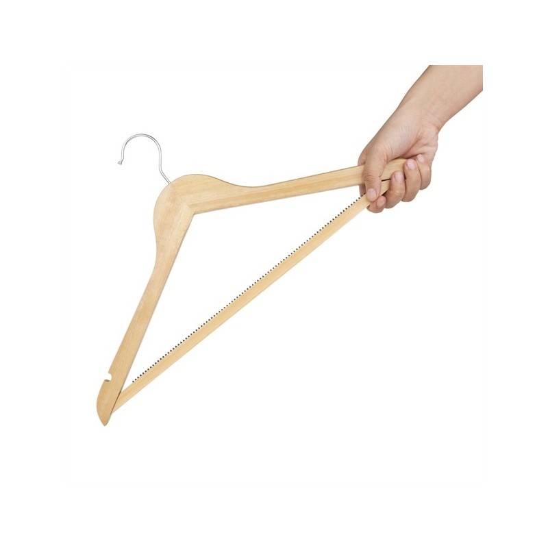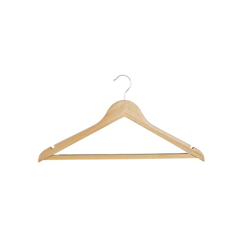 Bolero's natural wooden hanger with a non-slip trouser bar is a workhorse for any closet. Perfect for hotels, B&Bs, and cloakrooms, its sturdy construction can handle a variety of adult clothing. Notched arms prevent garments with straps or loops, like dresses and skirts, from slipping off, while the strong bar equipped with a non-slip grip keeps suits wrinkle-free.