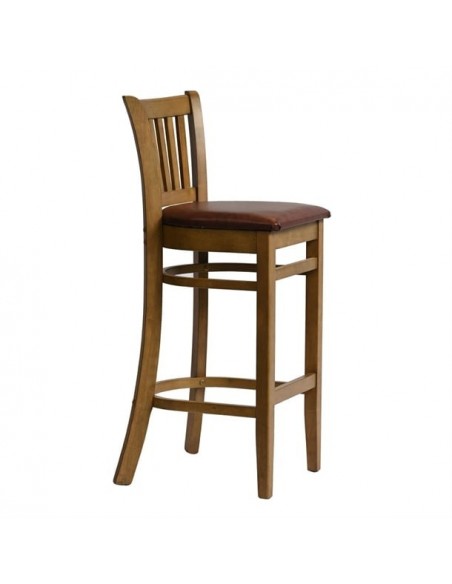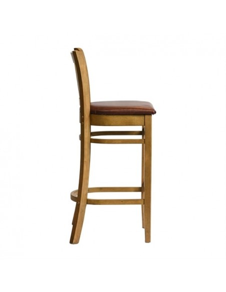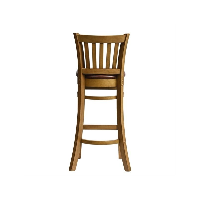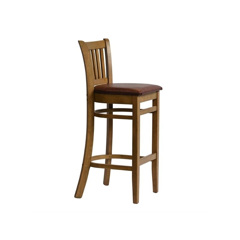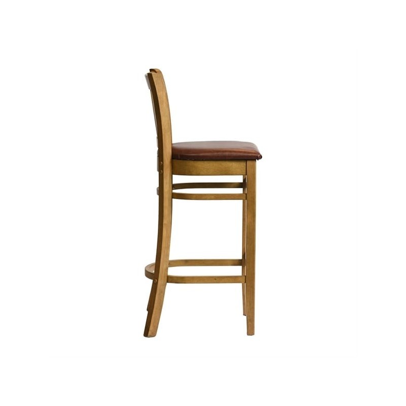 The Manhattan bar chair is the perfect height to pair with a poseur table, drinking shelf or right there in front of the pumps. Made to contract furniture standard, its solid wood construction ensures sturdiness and longevity, allowing the chair to withstand the demands of commercial environments. Its distinctive curved back with vertical slats offers a touch of traditional flair while providing excellent lumbar support. A bison espresso fabric covers the padded seat, adding a layer of both comfort and sophistication.