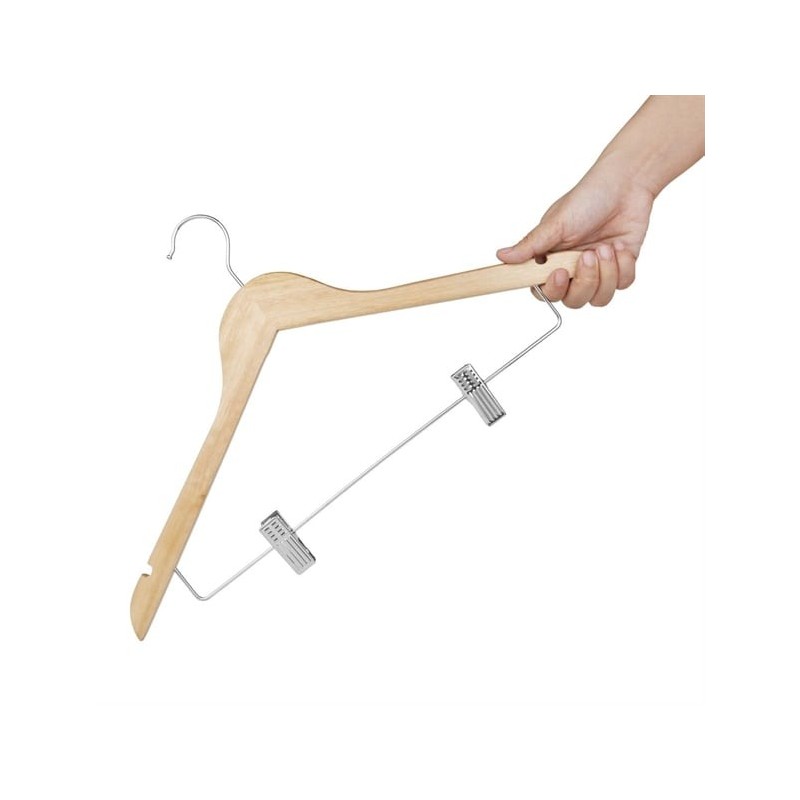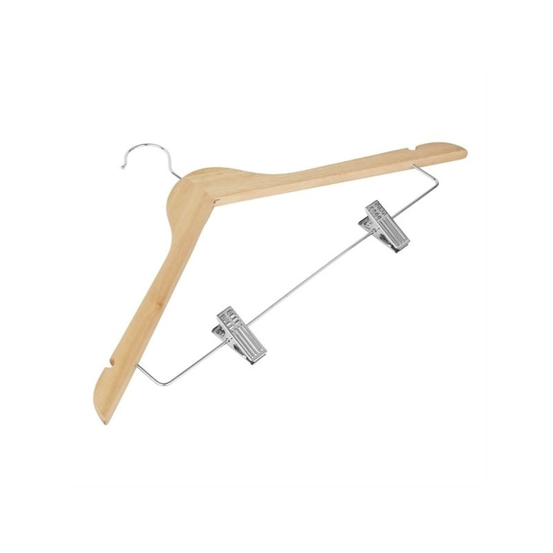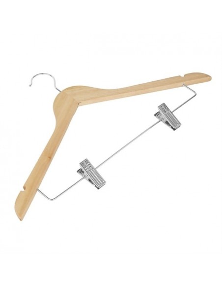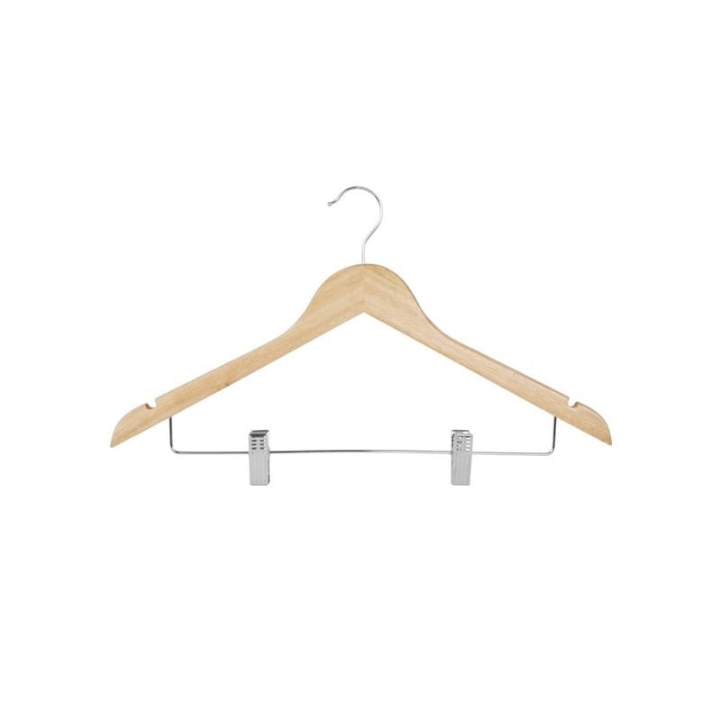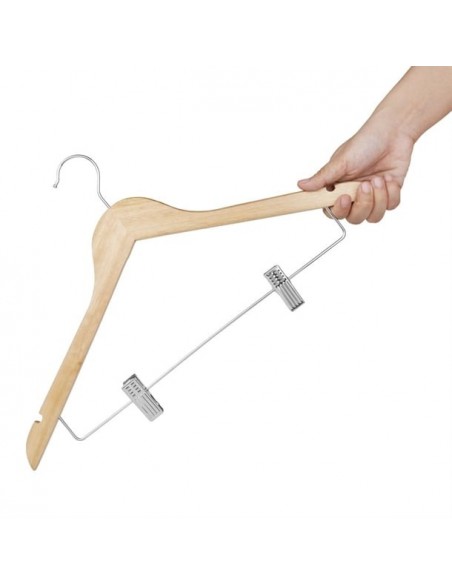 Bolero's wooden hanger with dual hanging clips is a workhorse for any closet. Perfect for hotels, B&Bs, and cloakrooms, its sturdy construction can handle a variety of adult clothing. Notched arms prevent garments with straps or loops, like dresses and skirts, from slipping off, while the swivel hook allows for easy positioning.