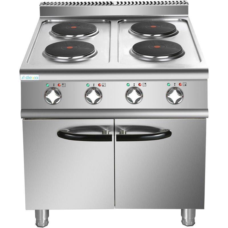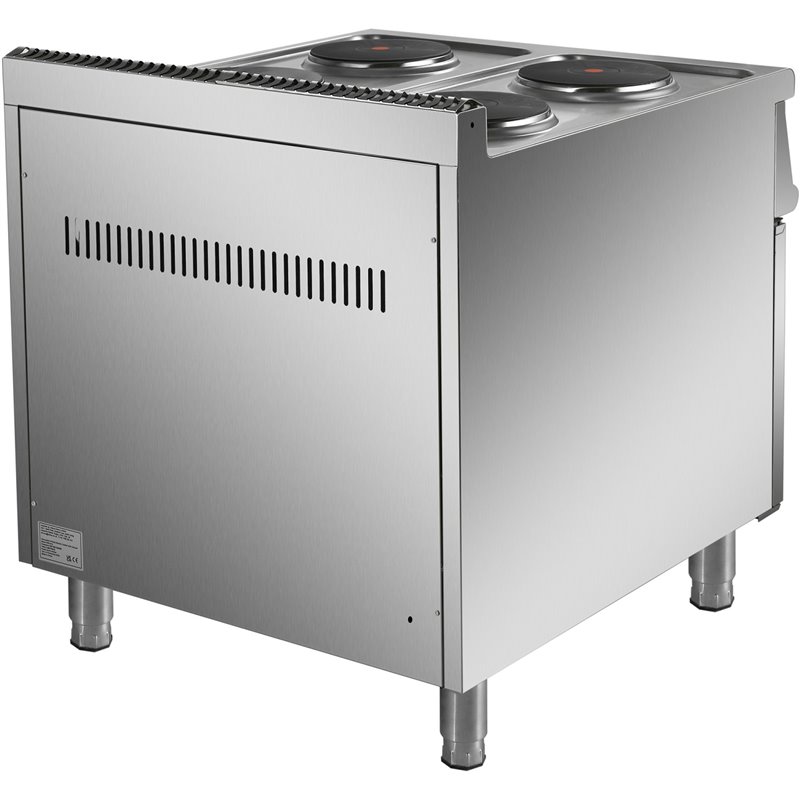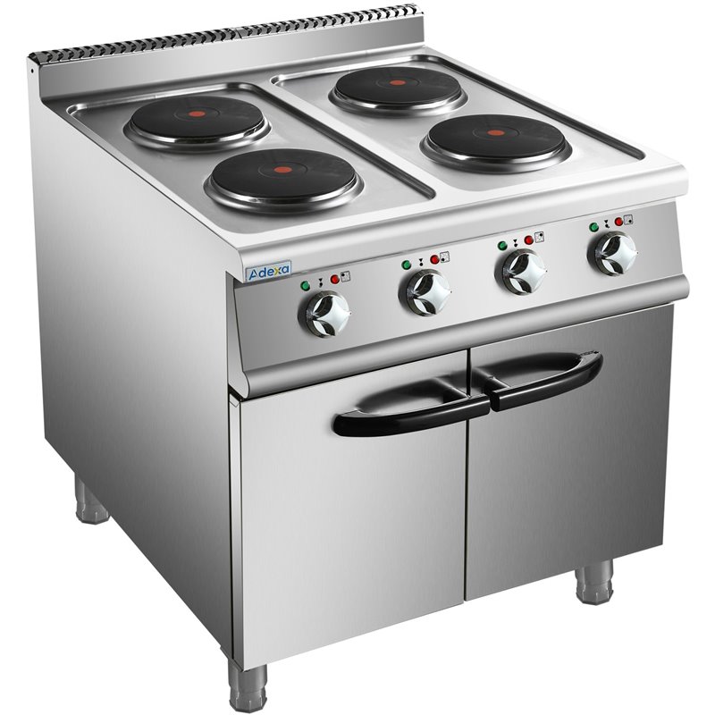 Heavy duty, high quality 4 burner electric cooker with cabinet base constructed from stainless steel. This electric range oven has a depth of 700mm to seamlessly fit in with our modular cooking range.