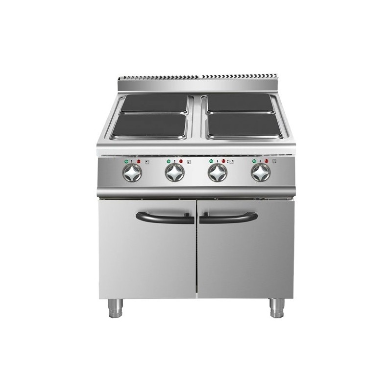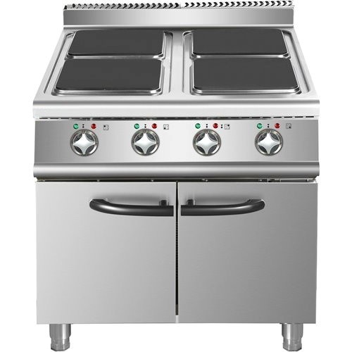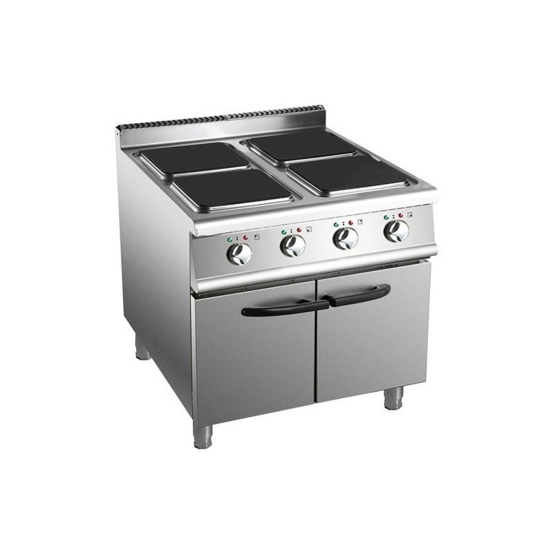 Heavy duty, high quality 4 burner electric cooker with cabinet base constructed from stainless steel. This electric range oven has a depth of 900mm to seamlessly fit in with our modular cooking range.