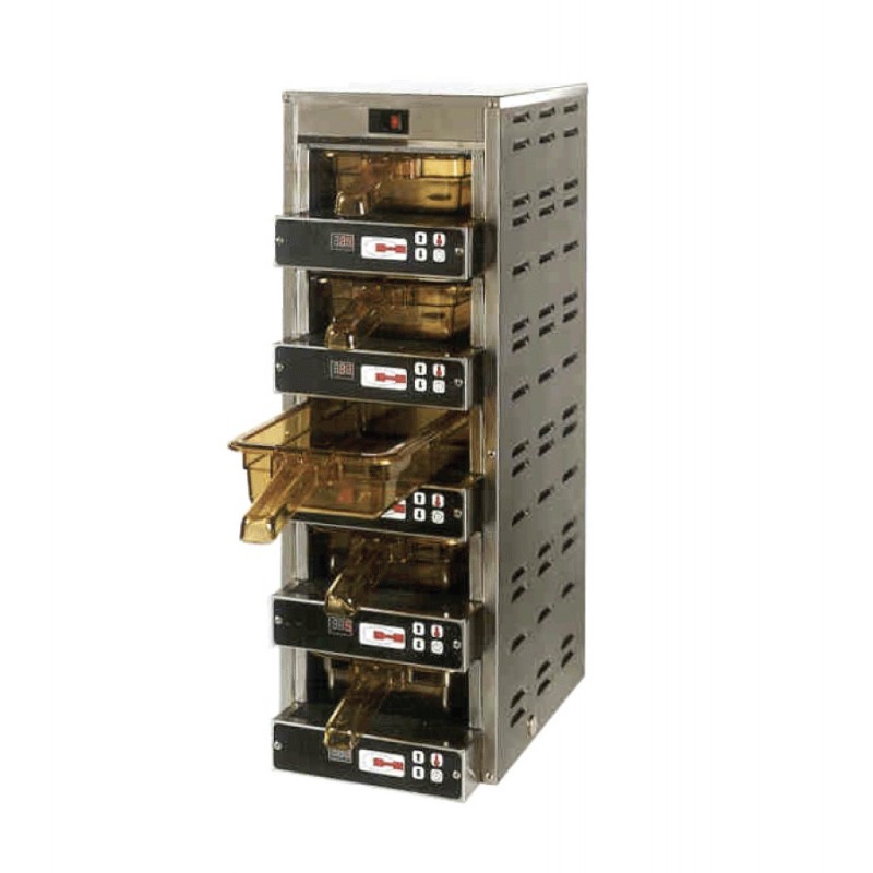 The Carter-Hoffmann MC1W5H modular holding cabinet is ideal for moisture-sensitive items, such as hamburgers, chicken, vegetables, etc. Built-in covers for each pan seal in moisture and along with the bottom heat, create the ideal environment for the food in each pan. The MC1W5H has 5 individually temperature controlled modules, and controls can be programmed for up to 6 items per pan.